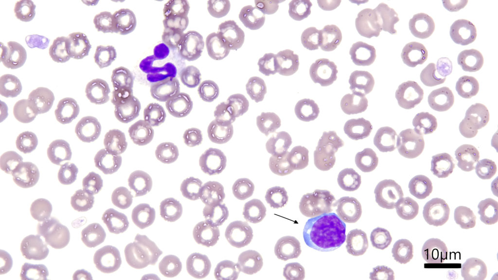 イヌ末梢血-リンパ球、対物レンズ100倍、Diff-Quik染色