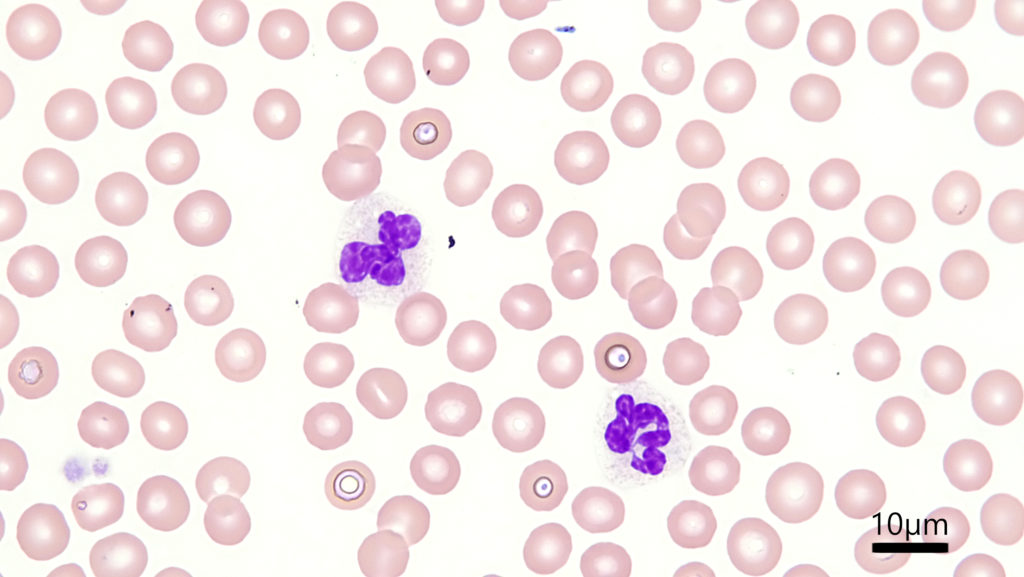 イヌ末梢血-好中球、対物レンズ100倍、Diff-Quik染色
