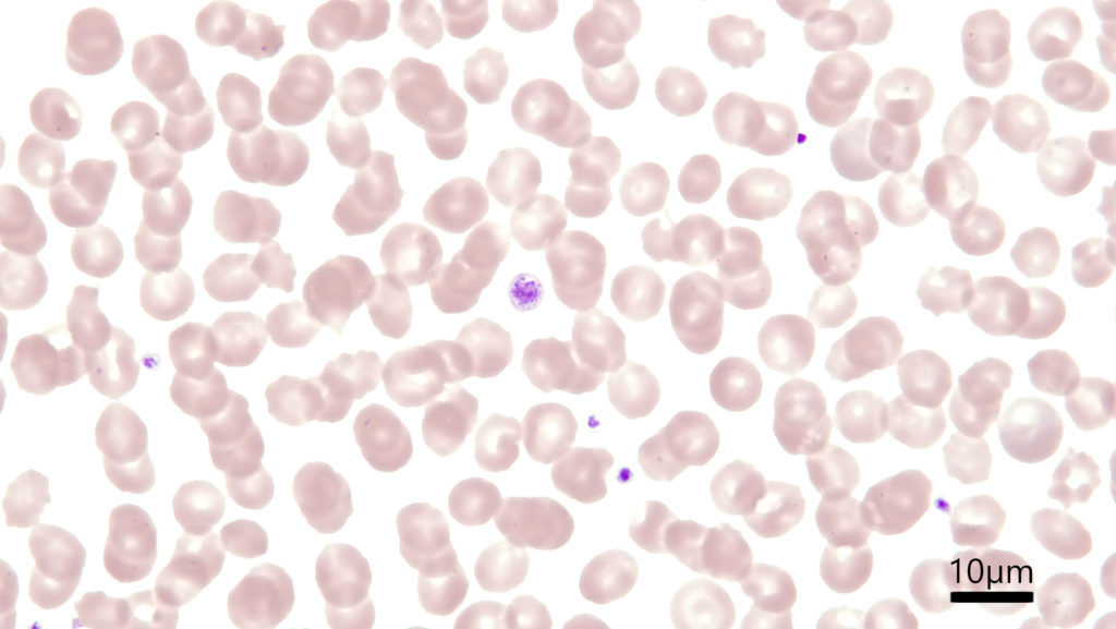 イヌ末梢血-血小板、対物レンズ100倍、Diff-Quik染色