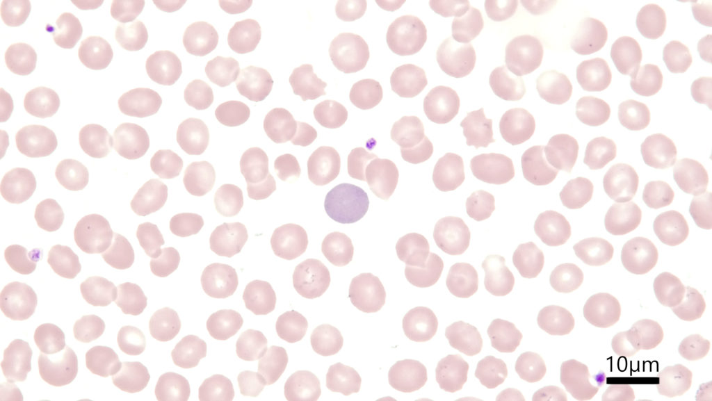 とりあえず今日のところは以上です。やはりライト・ギムザ染色の方が染まりあがりが繊細ですね。でも今回お示しした写真においては、リンパ球の核の染まり方や血小板の顆粒の染色性は意外とどちらもあまり大差ないように見えます。こうやって二枚を比較しながらみたことがなかったので、我ながら面白いですね。今度幼若細胞の核の染色性の違いがどう見えるのか、写真が撮り溜まったらまた第二弾をやってみたいと思います。いつになるか分かりませんが乞うご期待です。
